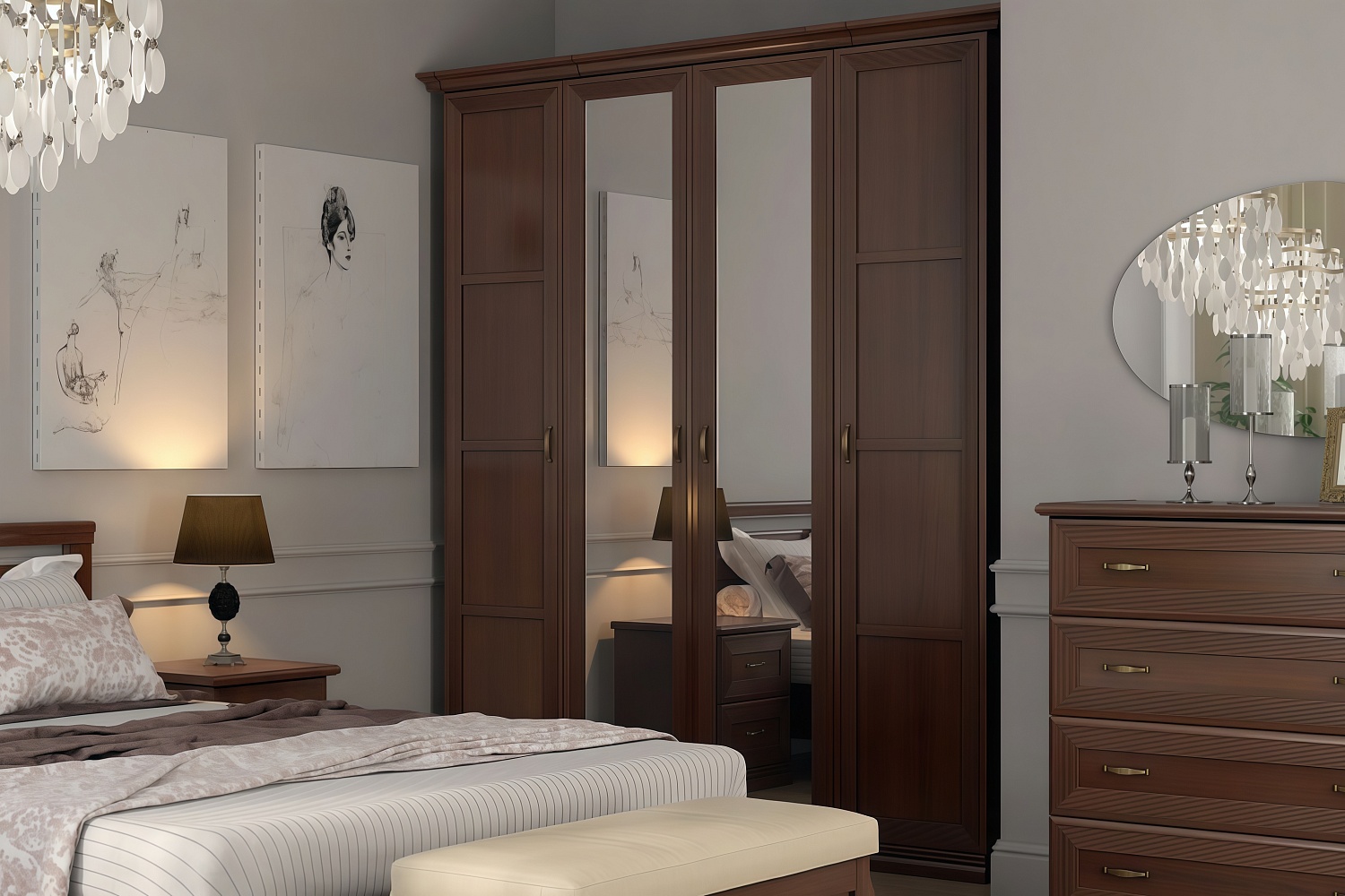 - Фасады: рамочные с гребенчатым профилем из МДФ, вставка — зеркало;
